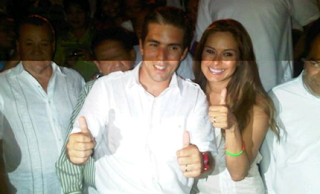 Con la concurrencia de la clase política del PRI y reuniendo a propios y extraños el candidato por la Coalición Comprometidos por México Fernando Reina Iglesias llegó acompañado de su esposa Galilea Montijo a su evento masivo en el anfiteatro de Sinfonía del Mar. La actriz apoyando en todo momento al acapulqueño poseedor del récord Guiness se muestra sonriente y da alegría a los asistentes al evento (previo)